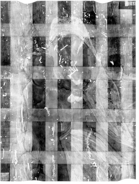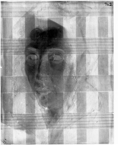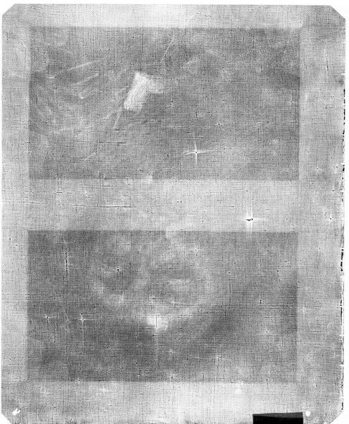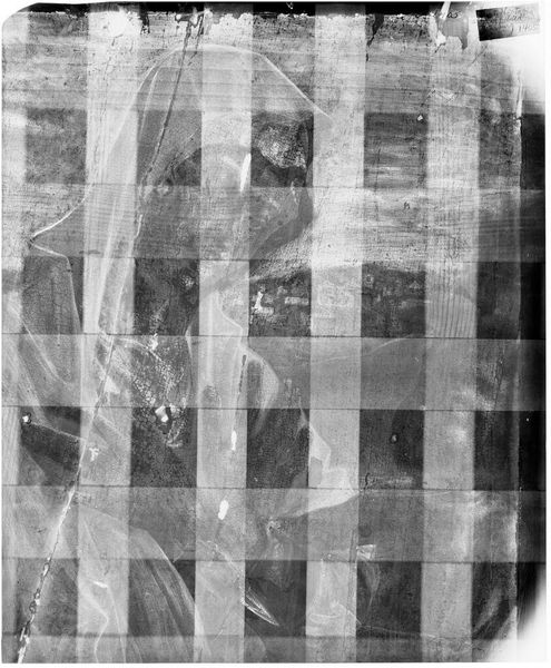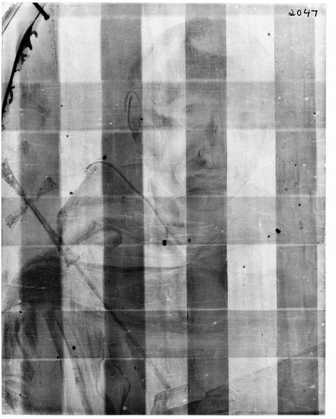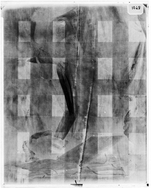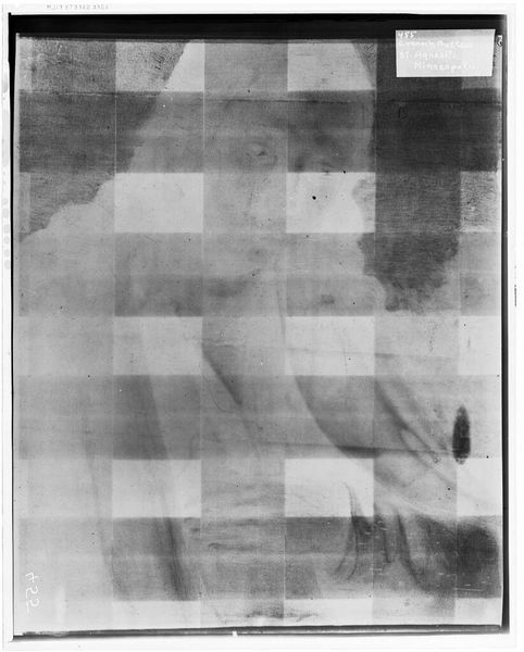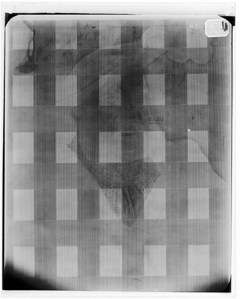 Editor: This is an x-radiograph of "Francois I" after Joos van Cleve, residing at the Harvard Art Museums. It’s so unusual, almost like a ghostly grid obscuring a portrait. What's your read on this piece? Curator: Well, it's an x-ray, a peek beneath the surface, literally! I imagine the artist puzzling over brushstrokes, the secrets of the Old Masters revealed in glowing shades. Does it make you think differently about the original portrait? Editor: Definitely. It feels like a deconstruction, showing the anatomy of a painting. Curator: Precisely! It reminds us that art is never just what meets the eye; there’s a whole hidden world supporting every image. Editor: I hadn't thought of it that way, it's fascinating!