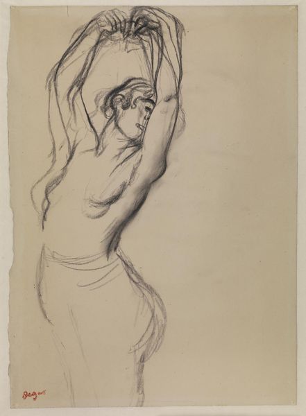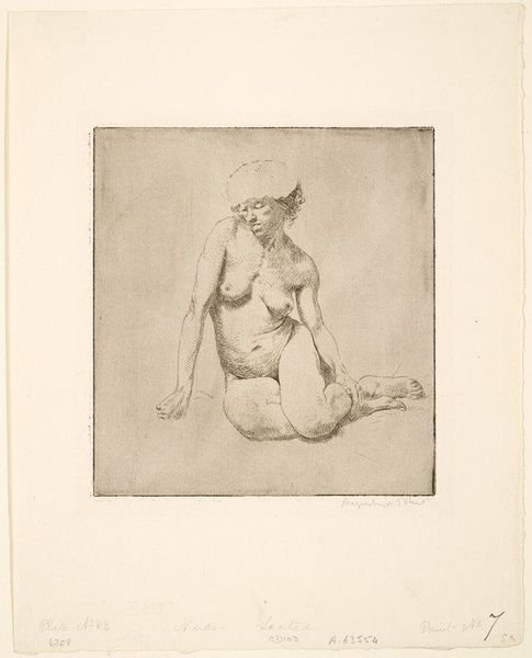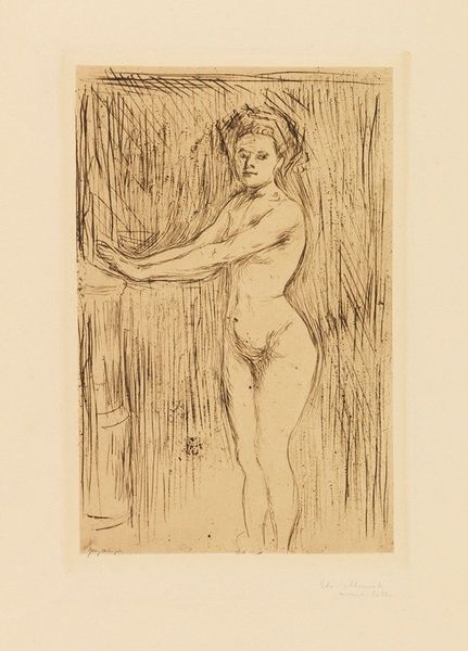 Editor: This is Wilhelm Lehmbruck's "Potiphar's Wife," an etching. The raw lines and the figures' poses suggest intense conflict. What symbolic weight do you see in this scene? Curator: The image reverberates with ancient power dynamics. Consider how Lehmbruck renders the male figure almost recoiling, his arms raised in a gesture that reads both as defense and supplication. The woman’s grip, her leaning stance…what does that suggest to you about control and vulnerability in this context? Editor: It feels like a reversal of typical gendered power. He seems trapped, while she embodies a kind of forceful desire. Curator: Precisely. Lehmbruck is tapping into a primal narrative, but also perhaps questioning conventional interpretations. Notice how the sparse background amplifies the psychological intensity. It’s almost claustrophobic. Food for thought, isn't it?