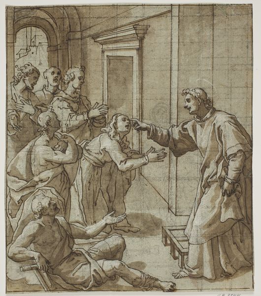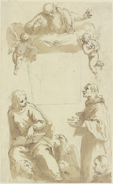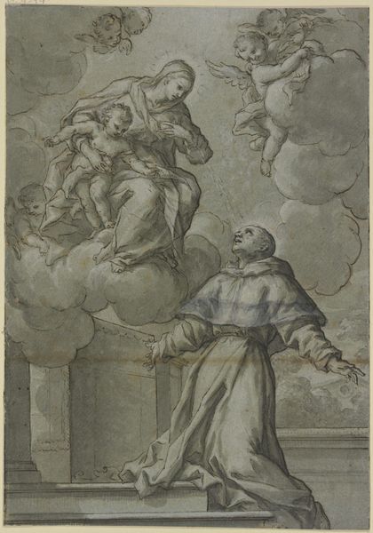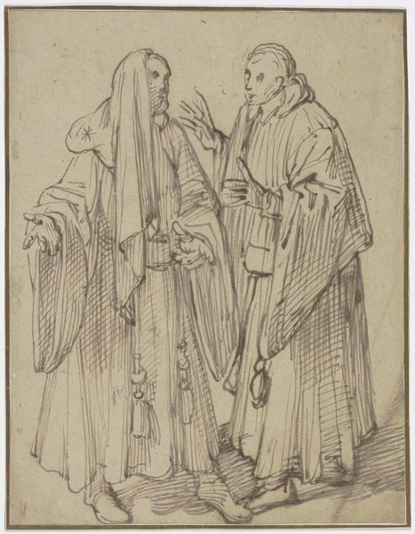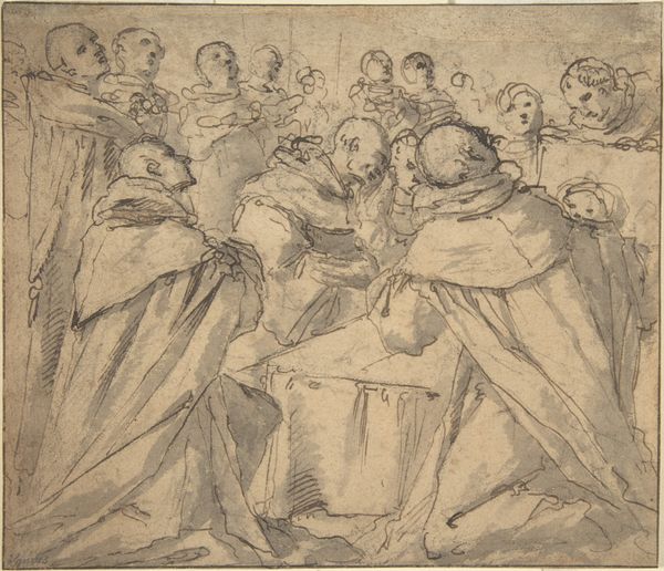 Curator: Standing here, you can see "Saint Francis of Assisi, with two Monks of his Order" created after 1611 by Guido Reni. It's currently held at The Art Institute of Chicago, and it's a striking example of Baroque figuration. Editor: Wow, there's something so compelling in the way all three figures gaze upward. There is this unified aspiration in their faces and in their bearing—like a magnet has pulled them upwards and forwards—that gives the piece an almost hypnotic feel. Curator: It’s intriguing, right? Made with ink, charcoal, chalk, graphite, and pencil on paper, it has an amazing range of tones for what are ostensibly basic materials. Reni truly coaxes out the texture from simple pigments. The cross-hatching lends so much to that sense of movement you mentioned. Editor: It makes me think about the way monastic orders are presented even today. The visual shorthand is of men enraptured with spiritual matters, totally separate from everyday concerns. Francis, especially, is a loaded figure given that his order was designed to advocate for the poor while ostensibly detaching themselves from any materialism. It is difficult to parse, isn't it? This need for representation, even in humble garb. Curator: Absolutely, though Reni's piece avoids ostentation. His ability to render the folds of their simple habits really captures their dedication, the quietude. To me, there's always an element of self-fashioning going on with these holy types—presenting an idealized vision. We always perform our own stories, even through acts of purported denial. Editor: And there's something very powerful, I think, about how this almost monochromatic, shadowed quality enhances the serious and somewhat dour mood. The textures lend realism to the monks’ features, showing a hint of the harsh realities they are meant to transcend, yes? We should not look at this drawing as just technique; there is always ideology! Curator: That’s very well put. Ultimately, it’s a meditation on devotion, on outward expressions of inward experience, and, of course, on the artist's own ability to conjure profound feeling. Editor: The longer I stand here, the more questions it provokes! It reminds us that images speak volumes, intentionally or not. The way Reni depicted Francis and his brethren remains highly impactful centuries later.