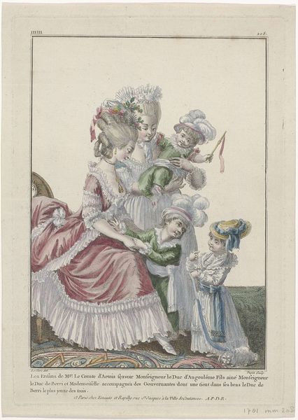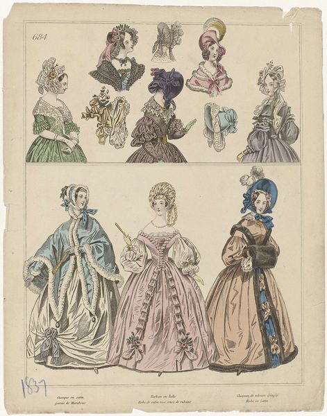This lithograph was created in 1889 by the monogrammist JC, and published by L. Michau for the Exposition Universelle in Paris. The print showcases a series of elaborate dresses and costumes, reflecting the fashion trends and social norms of the late 19th century. Focusing on the attire of women and children, the artwork invites reflection on gender roles and social expectations. The garments of women are extravagant, suggesting a life of leisure and display. Children are similarly adorned in miniature versions of adult fashion, a practice which highlights the construction of childhood as a site of social conditioning and aspiration. The composition may also remind us of issues of class, as it illustrates the divide between those who create fashion and those who consume it. Consider the historical context of the Exposition Universelle, a world's fair meant to celebrate progress and modernity. How does the artwork contribute to or challenge those narratives? What does it reveal about the values and contradictions of French society at the end of the 19th century?