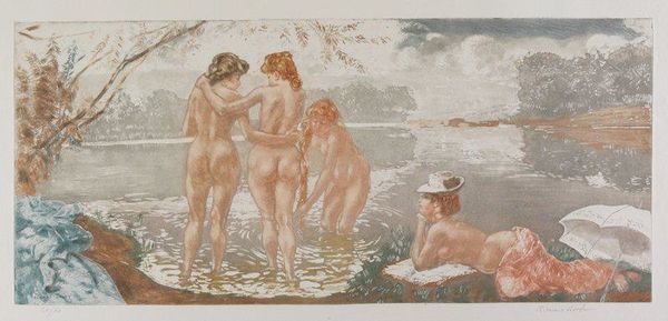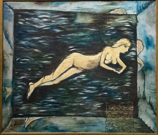 Editor: Arsen Savadov's "Slow," painted in 2007 with acrylic on canvas, presents this unusual scene of figures wading in the water with derelict ships in the background, and odd details such as scattered records floating in the water. It feels dreamlike, but also carries a certain weight. How do you interpret this work? Curator: The work strikes me as a post-apocalyptic reimagining of classical bathing scenes. Savadov situates idealized female forms within a landscape marked by industrial decay and perhaps even environmental disaster. The nude, traditionally a symbol of innocence and purity, is now placed within a contemporary narrative of global crises. What do you make of the large “S” and “W” placed seemingly randomly in the scene? Editor: They seem almost like advertisements or branding that survived some sort of catastrophe. The painting mixes familiar tropes like the female nude with commentary on modern society, creating a compelling dissonance. Curator: Exactly! It is tempting to view those letters as signs of past civilization, a lost order. But the women are reclaiming something. Notice how their bodies occupy positions of power even within this broken environment. The act of their bathing becomes defiant, doesn’t it? Editor: I see what you mean! They aren’t just passive subjects; they are active participants in this strange world. Even as survivors they inhabit and almost reclaim the space of both the natural and damaged world. Curator: The contrast between their vulnerable nakedness and their potent presence is what gives the painting its complex charge, raising questions about resilience, beauty, and the legacy of the Anthropocene. The historical allusions mixed with these figures, along with elements of today create interesting tension. Editor: I’m starting to appreciate how Savadov uses familiar images to offer a powerful social and environmental statement. Thanks for your insights! Curator: It was my pleasure! By layering those contrasting and competing ideas, he’s posing essential questions for us to consider.