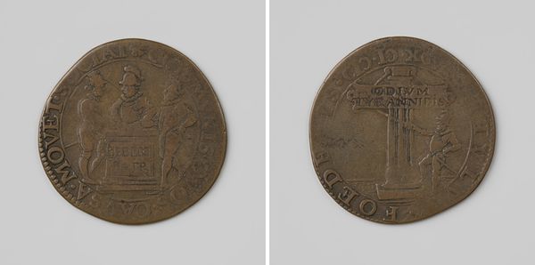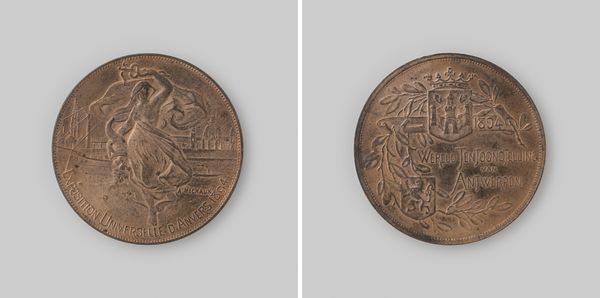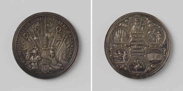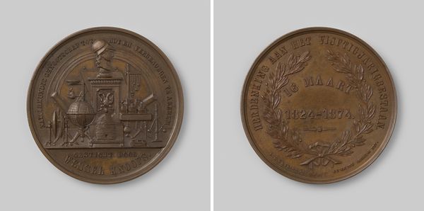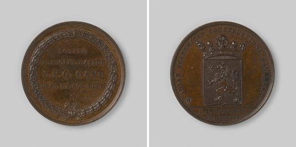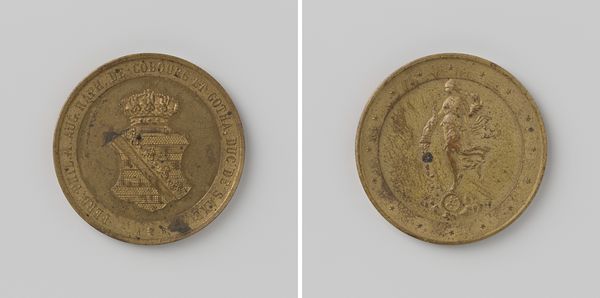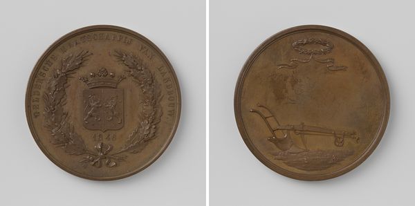 Editor: So this is a metal relief from 1832 by Laurent Joseph Hart, commemorating the marriage of Leopold I and Louise of Orleans. It feels almost... austere, in its symbolism. What stands out to you? Curator: Well, for me, these aren't just designs; they're potent symbols deeply rooted in cultural memory. The handshake, for example, beneath the crown – what does that convey beyond just agreement? It’s about legitimacy, isn’t it? The merging of two powers under divine or at least traditional sanction. Do you see how the torch and wreaths on the other side evoke ideas of enlightenment ideals and established traditions? Editor: That's fascinating. It’s more than just decoration, you're saying it communicates complex layers of power. The torch brings to mind classicism as well? Curator: Precisely! Neoclassicism drew heavily from classical antiquity and its emphasis on reason and order. It spoke of aspiration for a new era built on established principles. It also served to align Leopold I with ideals of justice, progress and civilization, important considerations for a relatively new nation establishing itself. How do you think these symbols would be interpreted by audiences familiar with Neoclassical art and philosophy? Editor: I guess they would read into it aspirations to build a modern, but orderly state based on these enlightenment ideals. It's amazing how much history can be embedded within these symbolic forms. Curator: And think of the metal itself – its durability, its potential to be replicated. This isn't just art for art's sake; it's about crafting a specific narrative, reproducing it, and embedding it in the cultural consciousness. Editor: It really does show how objects carry historical weight far beyond just aesthetics. I see this relief very differently now, I can see it has social and political layers that the artist was intentionally communicating. Curator: Precisely, the iconography transforms what seems a simple historical object into a loaded vessel, continuously resonating with evolving interpretations.