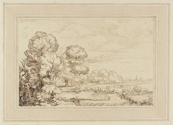 Curator: Richard Wilson's pen and brown ink drawing, "Composition: Lake and Trees, with Ships," presents an idyllic, pastoral scene. Editor: The immediate mood is one of quiet contemplation; the monochromatic palette evokes a sense of nostalgia, perhaps even a critique of idealized landscapes. Curator: Note how Wilson employs subtle hatching and cross-hatching to define forms and create depth. The ships, though small, are meticulously rendered. Editor: And yet, who benefits from this idyll? The leisure depicted likely masks the labor required to sustain it, a frequent erasure in landscape art of this period. Curator: The composition itself, with its balanced asymmetry, invites the eye to wander. Consider the placement of the trees, echoing the clouds. Editor: It’s a compelling window into the aesthetic values of its time, though we must acknowledge its potential blind spots regarding class and labor. Curator: Indeed, reflecting on these landscapes through various theoretical lenses enriches our understanding. Editor: Absolutely. Art like this demands we look both at and beyond the surface.