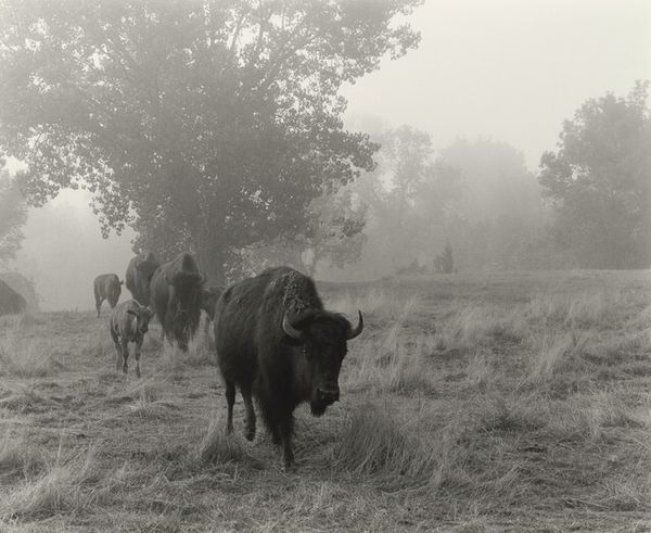 Curator: Terry Evans' photograph, "Cow and Horse Grazing at the Plenemuk Burial Mound Site, January 1, 1997," presents a muted, almost melancholic scene. Editor: Yes, there's a starkness to it. The grey sky, the muddy ground...it evokes a sense of quiet desolation. Curator: Knowing the site is a burial mound adds layers. How does the presence of domesticated animals, usually symbols of pastoral life, challenge our understanding of sacred spaces? Editor: It disrupts our romantic notions, doesn't it? Perhaps Evans is commenting on the appropriation or the inevitable integration of history into the mundane. Curator: Or even how land and memory are used, commodified, and changed over time. Editor: Precisely. It definitely gives one pause for thought regarding legacy and place. Curator: Indeed. It is a beautiful reminder of our complicated relationship with landscape and history.