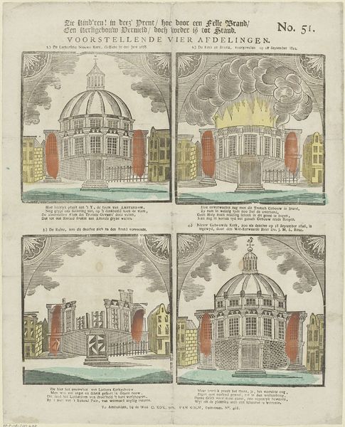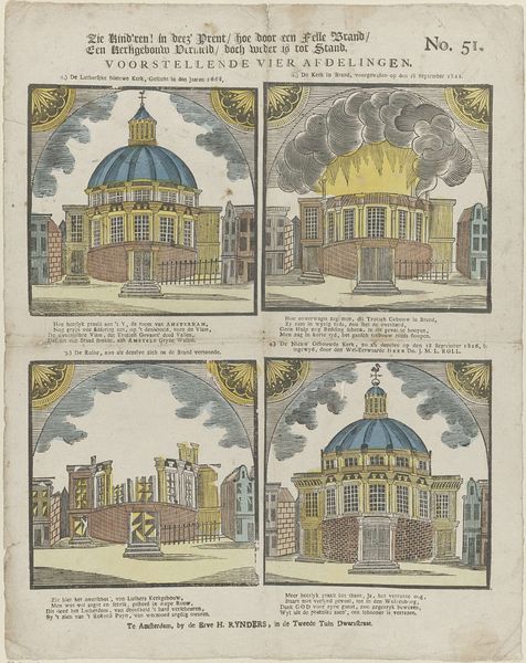 This print, whose full title translates to "The children! in this print / how through a fierce fire / A church building is destroyed / but has been restored," was created in Amsterdam by the widow C. Kok-van Kolm. The print commemorates significant fires and subsequent rebuildings of various churches. Each scene encapsulates narratives of destruction and renewal, mirroring the trials and resilience of religious communities. Produced by a woman, the print offers a unique perspective on historical events, reflecting perhaps, the artist’s own experiences of loss and recovery. Consider the emotional weight of the image: a testament to faith tested by adversity, and a society grappling with disasters. The choice to depict these events through the lens of architectural transformation speaks to the enduring significance of these religious spaces. The artist seems to suggest not just the physical rebuilding, but the restoration of community bonds and spiritual fortitude.