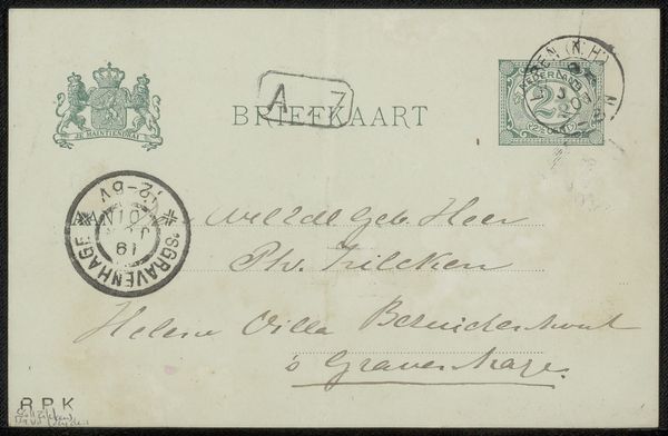 Editor: This is a postcard, "Briefkaart aan Jan Veth," created by Eduard Karsen in 1891. It’s an ink drawing on paper. There is something really interesting about a pen drawing *of* a postcard, using the same medium. What strikes you about it? Curator: The very fact that it is an *image* of a postcard compels us to decode its signs: postal marks, address and stamps, function as visual elements, rather than for actual mailing, ironically pointing to themes of communication and connection within a formal structure. How do the scripted lines divide up the pictorial space? Editor: I see what you mean. The address is very carefully inscribed; it is not just informative text but part of the composition, delineating the surface. The curves and lines act almost as a filigree, dividing up the plane. So is it more about form and shape than, say, social history? Curator: Indeed. While it may whisper historical narratives, our focus remains on the artwork’s inherent components—line, form, and spatial arrangement—asking questions such as: how do the different visual marks interplay within the overall composition, and how are the curves distributed over the image? Editor: It is such an ordinary object, rendered with such precision…it seems the commonplace itself can be worthy of artistic observation and restatement. I guess that shifts my focus. Curator: Precisely! By focusing on its internal structure and artistic intentions, it prompts one to decode meaning not through the artwork’s supposed historical significance, but rather its careful formal composition.