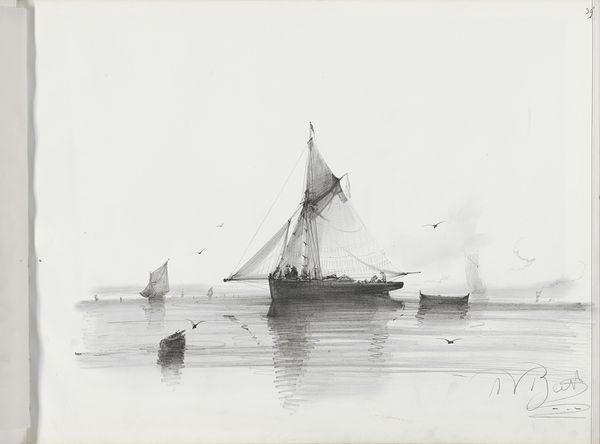 Albertus van Beest made this drawing of figures on a sailing ship off the coast using graphite and paper. The texture of the paper and the mark-making qualities of graphite allowed him to build up tonal depth and a sense of atmosphere, giving the drawing a misty, Northern light. Van Beest would have used finely sharpened graphite sticks of varying hardness to create the image. The marks range from delicate and wispy to more densely shaded areas. These techniques imbue the scene with social and cultural significance. Maritime transport was the engine of Dutch trade and naval power. The work involved in shipbuilding, sailing, and commerce provided a livelihood for many, and the shipping industry underpinned global networks of consumption, labor, and politics. Examining the materials and the making of this drawing gives insight into the intersection of art, craft, and social context.