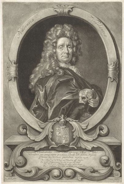 Curator: Oh, he looks rather imposing, doesn't he? A man of stature and perhaps, dare I say, a little bit… smug? Editor: This is Jacques Grignon's portrait of François de Vendôme, the Duke of Beaufort, a grand admiral of France. It presents him within a theatrical oval frame. Look at all the maritime imagery. Curator: The frame is as captivating as the subject! It's almost like a stage, and he's giving us his most dramatic performance. It begs the question, who was he trying to impress? Editor: Well, Beaufort was a significant figure in French naval history, so this portrait would have served to promote his image, valor, and the power of the French navy itself. The naval trophies and emblems are there to signal his authority and accomplishments. Curator: Even though it's an idealized image, I see the human. The curls are luscious, but the eyes hint at something else entirely. Maybe a touch of melancholy. Do you agree? Editor: Perhaps. These portraits are always so carefully constructed to project an image, but the most lasting ones allow something of the person to peek through. Curator: Yes, and it's in that peek that we find the real conversation. Editor: Indeed, and perhaps that's the most valuable thing we can ask from these images.