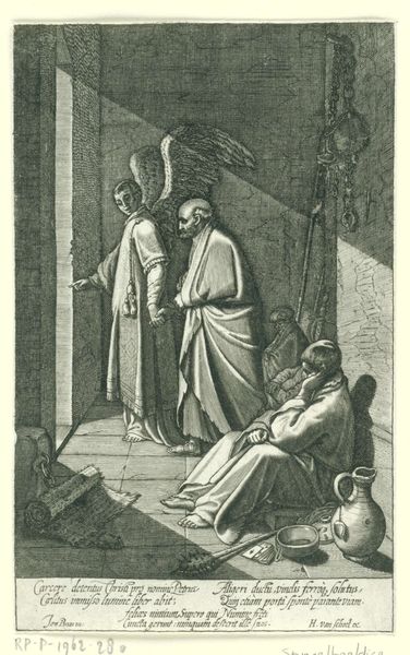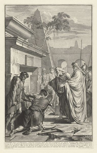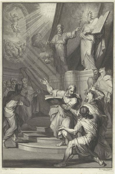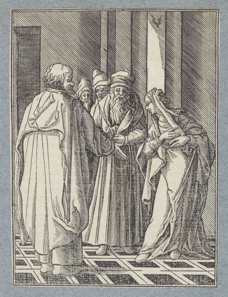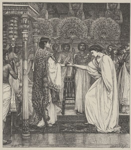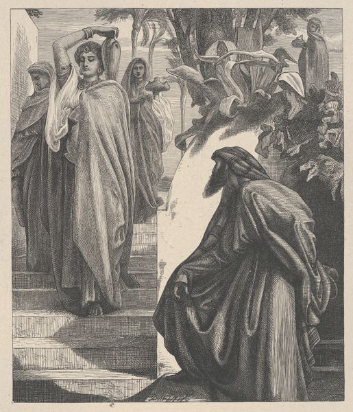 Editor: This is Simeon Solomon's "Melchizedek Blesses Abram, from 'Dalziels' Bible Gallery,'" created sometime between 1863 and 1881, an engraving, so a print made from a drawing. The linear quality and detailed cross-hatching give the figures a sense of weight, but also rigidity. What stands out to you from a formal perspective? Curator: Indeed. The density of line, what some might even call 'busy-ness,' serves to flatten the image. Notice how Solomon uses line not just to define form but to create textures – look at the rendering of drapery versus flesh. The high contrast exacerbates this planar effect. What this does, however, is heighten the expressive intensity. Editor: Expressive intensity, how so? Curator: Consider how the contrasting dark lines concentrate our attention on key gestures, the blessing itself. It is not just the historical subject matter that invests the image with significance; Solomon's use of contrasting dark lines leads us to the blessing's performance. Do you see how this tension and visual density draws you in? Editor: I see what you mean. I initially found the engraving overwhelming, but the high contrast directs my focus to that central, pivotal interaction and reinforces its significance. Curator: Exactly. It is within these formal contrasts, this strategic orchestration of line and tone, that the work generates meaning and invites a closer, more contemplative observation. Editor: Thank you; seeing the contrast between the lines making texture, versus lines guiding our sight gives a richer understanding. Curator: And by examining the composition’s internal logic, one begins to discern its deeper visual structure.