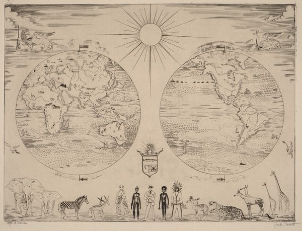 Curator: Herman Coets' "Schepping van licht en donker," potentially created between 1700 and 1723, is a fascinating example of Baroque engraving using ink on paper. Editor: The sepia tones give this piece a dreamlike quality. The way the sphere seems to float in that textured sky also hints at something celestial, otherworldly even. Curator: Indeed. Notice how Coets meticulously constructs the composition. The orb is placed centrally and circumscribed in the clouds. It produces visual balance but also symbolic hierarchy. Editor: The celestial sphere dominates, doesn’t it? One sees constellations within that lighter band near the bottom...it appears there's symbolic content to decode. Does that tiny text offer clues? Curator: In its visual economy, this inscription underscores the binary oppositions through textual means. By referring to light and dark and by presenting celestial mechanics it brings cosmological structures of day and night into view. Editor: You are right: light streams from above. The contrast in tones does delineate space--is there a specific cosmological belief driving the image? I find myself interpreting the composition as a bridge between divine order and our human understanding of space. Curator: Precisely, but its aesthetic choices also merit reflection. Coets seems attuned to the visual vocabularies used in emblem books of the 17th century, but it is his formal decisions on composition which make his contribution valuable for Baroque printmaking. Editor: Perhaps the image speaks to a particular kind of yearning. It captures this moment when old beliefs confront new scientific order…one imagines it was comforting to frame these expanding views through religion. Curator: An insightful perspective. "Schepping van licht en donker" speaks not just to celestial structure, but also to our inherent quest to comprehend it, a quest echoed in its intricate form. Editor: Exactly. It’s like we're gazing not just at the world, but into the very process of making sense of it all. A symbolic microcosm for understanding Baroque visual culture.