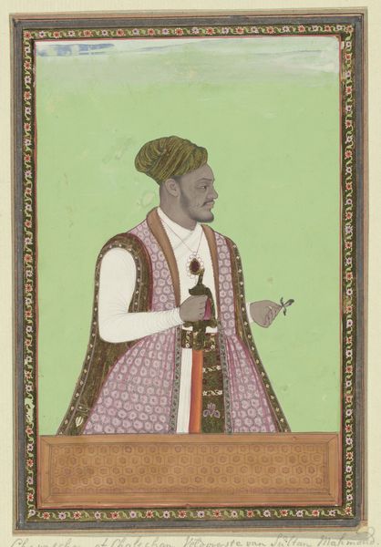 Editor: So, this is a watercolor painting titled "Portret van Sultan Muhammad-Quli, zoon van Muhammad-Quli Padsha," dating back to about 1686. It’s from the Rijksmuseum, and the artist is anonymous. It strikes me as quite regal and formal, especially the way he’s presented with what appears to be a halo. What’s your take on this portrait? Curator: The very act of commissioning and preserving this portrait, especially within an Islamic artistic tradition, suggests a deliberate attempt to construct and project an image of authority and legitimacy. This becomes especially pertinent given that the Sultan ruled Golconda after his father. How does the painter signal Golconda’s place in global politics? Editor: I notice a halo behind him. Curator: Yes. That's visually intriguing, isn't it? The halo, often associated with divine figures in other cultures, being employed here tells us something about how the Sultan intended to be perceived, or how his court wished him to be seen. This halo subtly asserts his power and almost sanctifies his rule, while connecting him, whether deliberately or not, to global political and religious images. What might it mean for this Sultan to commission this work, in this visual style, for his legacy? Editor: That's fascinating. I hadn't considered the political implications of something like the halo. It makes you think about who this image was intended for and what kind of message they were trying to convey. Curator: Exactly! The portrait isn't just about representation; it's about actively shaping perception and cementing a ruler's place within the socio-political landscape. The choice of materials – watercolor – would also influence our interpretation, its relative ease allowing its movement throughout various global artistic and political networks. Considering the Sultan's political life, do you feel the artist was successful? Editor: Definitely. I see how visual art and cultural artifacts can be powerful tools for communicating and even manipulating ideas. It's more than just aesthetics. Curator: Precisely. Art serves as a powerful medium through which societal, cultural, and historical narratives are constructed and negotiated. So what started off as a pretty image has all of a sudden opened up into quite a few stories about trade, legitimacy, and more!