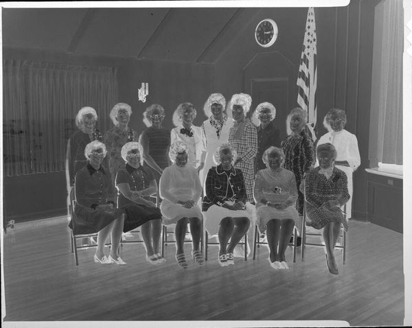 Curator: Gazing at this photograph by Jack Gould, taken at an unknown date and titled "Untitled (women at Women's Club meeting)", what immediately strikes me is the feeling of hushed concentration in the room. Editor: Absolutely, it's almost as if I can hear the quiet murmur of the women observing the presentation, a sea of hats and light dresses, poised in anticipation. It evokes a sense of communal learning and women's gatherings of the time. Curator: The image is modest in size, just a few inches square. But I think Gould, through his lens, really captured the spirit of these women, perhaps seeking intellectual stimulation and creative engagement in a time of social change. Do you agree? Editor: I do. These women are front and center in their own narrative, not relegated to the domestic sphere. The art on the walls behind them seems to reflect their own creative aspirations. It speaks to the power of women's clubs as spaces for self-expression and community building. Curator: It's a touching record of a moment in time. Editor: A snapshot of feminine intellect and artistic appreciation in action.