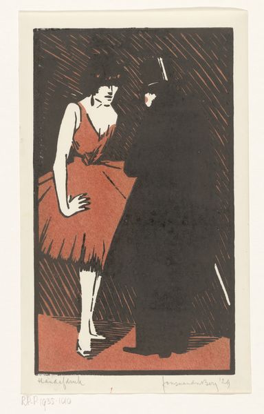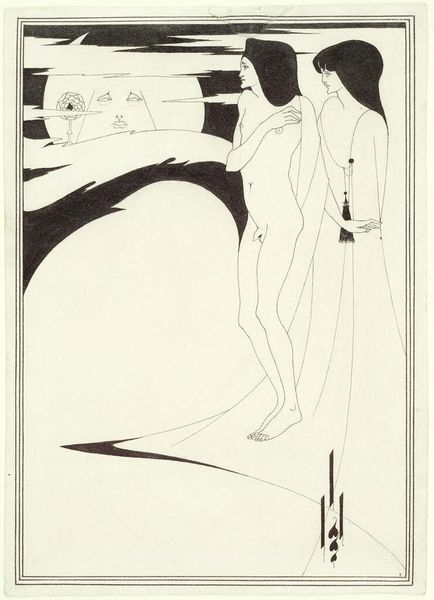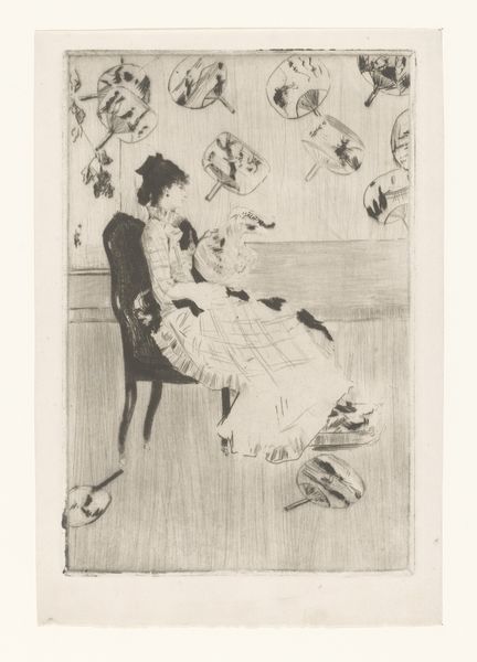 Curator: John Sloan's "Atlantic City Beach" presents such an intriguing snapshot. I'm immediately drawn to the bold contrasts in black and white, the overall design feels so graphic. Editor: It gives the impression of a society caught between rigid social norms and the emergent freedom of leisure, doesn’t it? Curator: Absolutely. Look at the patterned textiles, the striped awning. Sloan was a master printmaker, and this piece highlights the manufactured and commodified experience of leisure for women. Editor: And the figures themselves. The woman in the elaborate hat and gown seems to embody older constraints, while the bathing costume suggests a movement towards liberation, yet even it is bound by a belt and obscured by a blanket. Curator: There is a tension between private experience and public display as well. Sloan clearly understood that the beach was a stage for the performance of self. Editor: I agree. Thinking about the social constraints of the early 20th century, this image speaks volumes about gender, class, and the evolving landscape of American life. Curator: Indeed, a fascinating intersection of materiality, leisure, and social commentary, all captured within the frame of a day at the beach. Editor: It makes you wonder what these women were thinking.