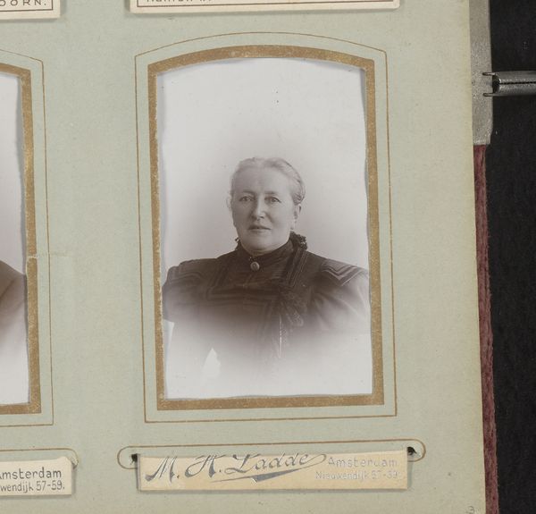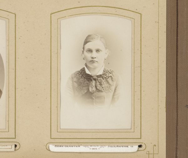 This is a photographic portrait of a woman created by Photographisches Atelier. The composition is strikingly simple, dominated by the woman's face and upper torso, set against a plain background within a decorative frame. The limited tonal range and soft focus contribute to an overall effect of restrained dignity. The photograph invites a semiotic reading. The subject's modest attire and hairstyle, coupled with her direct gaze, project an image of middle-class respectability. The controlled palette—ranging from off-whites to sepia tones—reinforces this sense of moderation. The rectangular frame, rounded at the top, contains the image, while the woman's calm expression suggests a carefully constructed representation of self. Consider how the photographer uses these formal elements—composition, tone, and framing—to communicate a specific message. The image functions not just as a record of appearance but as a cultural artifact, reflecting and reinforcing social norms and values. This interplay between form and cultural context invites us to decode the visual language of the portrait and understand its broader implications.