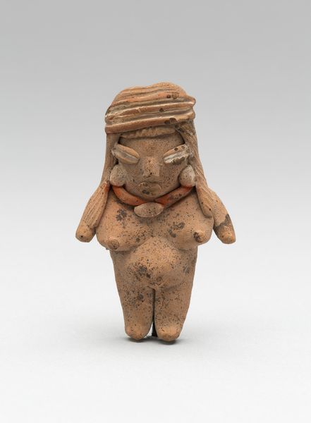 This is a ceramic figurine made by the Nazca people of ancient Peru. The painted markings on her face and body offer a glimpse into the social world of this culture. The Nazca civilization flourished in a desert environment where water was a precious resource, and its control and distribution were crucial for survival. The markings on this figurine might relate to fertility or agricultural rituals, reflecting a society deeply dependent on the earth's bounty. The care taken in the creation of the figurine suggests its importance within the community and in the institutional life of the culture. We can imagine it featuring in events or ceremonies linked to ancestral worship or the agricultural calendar. Archaeological reports can provide more information about how figurines like this were used. These insights, alongside the study of religious beliefs and ritual practices, can help us understand the figurine’s place within the wider Nazca social and institutional context.