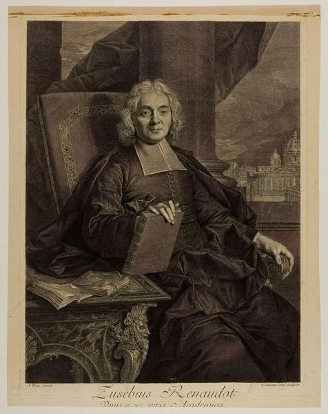 Curator: Looking at this print, made by Johann Georg Wille, dating back to the 18th century, we see Jean Baptiste Massé, a painter and councilor. Editor: The symbolism of the painting within a painting is striking—the angelic figures certainly evoke a sense of the divine and spiritual. Curator: Indeed, the print itself, rendered with such detail, acts as a kind of symbolic portrait, highlighting Massé's social standing within the Royal Academy of Painting and Sculpture. Editor: And notice the tools of the trade displayed—palette, brushes, the artist's paraphernalia arranged almost ritualistically. I wonder, though, about the implications of representing an artist in this way. Is it reverential or critical? Curator: Perhaps both. Consider the shifting power structures of the time—the artist moving toward a figure of increased cultural authority, yet still reliant on patronage. Editor: The symbols speak of more than just Massé; they echo a particular era and its artistic values. Curator: It's a fascinating window into the complexities of artistic identity and social status in the 18th century. Editor: A subtle, layered piece—revealing how artists wished to be seen, and perhaps how society wished to see them.