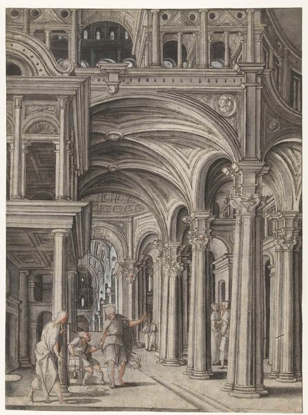 Curator: Looking at this engraving titled "Kerkinterieur," or "Church Interior," dating roughly from 1610 to 1661, attributed to Gerard Houckgeest, I am immediately struck by the ways religious spaces reinforce established power structures, shaping bodies, defining class strata and circumscribing spatial agency within society. What catches your eye? Editor: The light, actually, despite it being a print. The linear perspective directs my eye to the back and seems to diffuse an ethereal glow from somewhere beyond. There’s an almost stage-like quality to it all, with the figures acting out various symbolic roles. Curator: The perspective is incredible for the time. It suggests a need to meticulously dominate through geometry. These weren't passive depictions, but calculated statements reinforcing the Church's grandeur at a pivotal, often politically-fraught moment. What I find fascinating is that even mundane scenes within this grand space echo social stratification: notice the wealthy casually stroll accompanied by dogs while the poor, burdened, are cast at the edges? Editor: Right, the presence of those ordinary folk, though small in scale, underscores the church's role as a community hub. I wonder if Houckgeest was consciously referencing the “vanitas” tradition—a reminder of mortality amidst the splendor. Curator: Precisely, and what better place to highlight humanity's existential angst than beneath the architecture erected in service of an interventionist divinity? What if the splendor that appears is merely symbolic to its true nature? The fact it’s an engraving is relevant; easily reproduced and distributed, these images further instilled the Church's image of power throughout society. Consider, too, its position amidst broader, often fractious theological conflicts. Editor: So it serves almost as a form of propaganda in some sense, meant to instill reverence, or perhaps even fear? As I look more, I can appreciate those darker themes, too—how even the act of worship is subtly framed by class. Curator: Precisely. And what’s key here is recognising that every artistic element - perspective, the figure arrangement, even the medium choice – contributes to a broader cultural script defining social and spiritual relations. Editor: You've opened my eyes to that broader significance. It's far more than just a beautiful interior. It’s about who occupies that space, both literally and symbolically. Curator: Indeed. Houckgeest’s "Kerkinterieur" provides not only aesthetic pleasure but offers a glimpse into a world deeply entrenched in social hierarchy, sustained through both power and symbolic displays. Editor: Exactly. I'll certainly look at architectural renderings in a different light from now on! Thank you.