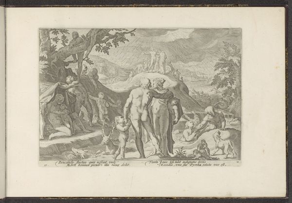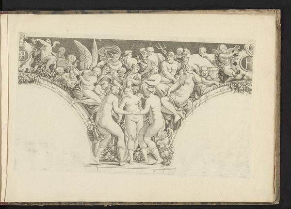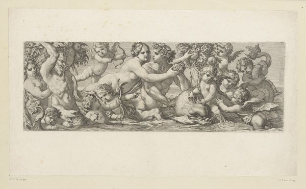 Curator: Here we have an engraving entitled "Venus en Mars betrapt door Vulcanus," which translates to "Venus and Mars Caught by Vulcan," dating from about 1710 to 1714. It’s currently held here at the Rijksmuseum, and it’s attributed to Jakob Wilhelm Heckenauer. Editor: The first thing that strikes me is the stark contrast in mood. Venus and Mars appear almost nonchalant, nestled amidst clouds and cupids, while Vulcan looms as this brooding figure on the right, radiating a sense of betrayal. Curator: Absolutely. It’s interesting to consider how this imagery, derived from classical mythology, functions within the baroque period. We’re seeing the continuation of these mythological narratives used to explore complex human emotions. Editor: Indeed, Vulcan’s presence is heavy with symbolic weight. The discarded helmet and broken tools beside him speaks volumes about interrupted labor and disrupted order, even about male impotency after his love was mocked. It’s almost a theatrical tableau of divine embarrassment, right? Curator: Precisely, and Heckenauer leverages that inherent theatricality of the baroque style. The print emphasizes drama with stark contrasts, a crowded composition that reinforces the tension. We're meant to reflect on the fragility of honor. The institutional values of marriage at stake... it certainly resonates in light of changing social values, then as it does today. Editor: And those cherubs in the background? They transform what could be a scene of high tragedy into something almost farcical. Their carefree expressions suggest an indifference to the gravity of the situation, perhaps symbolizing the relentless, amoral nature of desire. Is love truly blind or is love a source of strife that we all must deal with and come to learn from, and even perhaps celebrate? Curator: That’s a compelling observation. By embracing classical stories, yet subtly shifting perspectives to underscore humanity's follies, this engraving finds its lasting relevance, both culturally and historically. Editor: Seeing this from the perspective of symbolism and visual storytelling really drives home just how layered art can be! Thank you, Jakob Wilhelm Heckenauer, your cultural mark lives on!