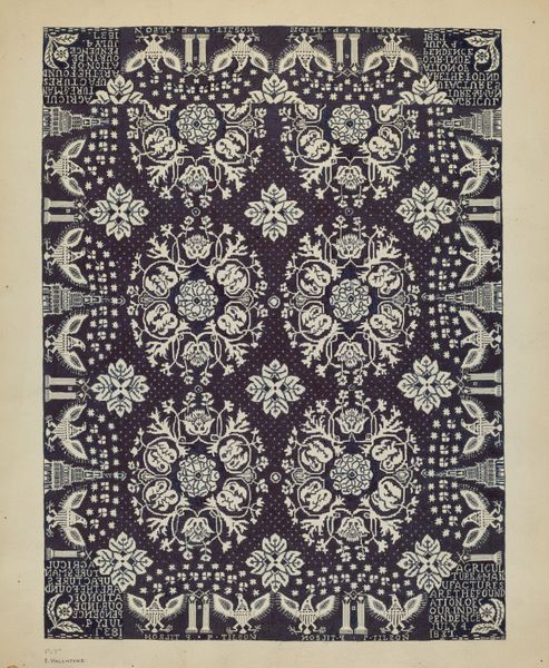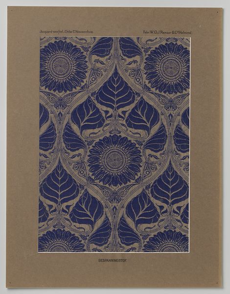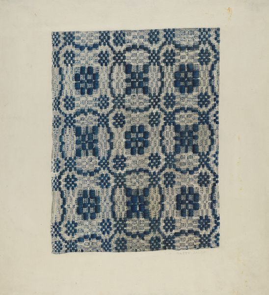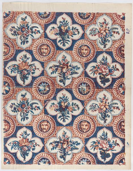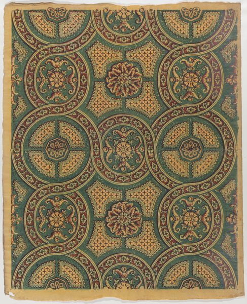Editor: We’re looking at an anonymous piece called "Sheet with a running circles pattern with rosettes," dating from 1800-1900. It looks like a print, possibly for a textile design, currently held at the Met. It has a hypnotic effect because of the intense repetition, but it's pretty, what do you make of it? Curator: This pattern immediately brings to mind the Arts and Crafts movement, even though it's slightly earlier. We have this industrial revolution happening all over the western world. The idea of textiles as merely functional objects was being challenged, as artists pushed back, valuing craftsmanship. How do you think the pattern speaks to that ideal? Editor: Well, the repetitive nature suggests it could be mass-produced, kind of contradicting the hand-crafted idea. But at the same time, the intricate details within each circle seem to point towards skilled artistry. Curator: Exactly! And consider the cultural context. Printed textiles became increasingly accessible during this period. This sheet represents a negotiation, reflecting tension between mechanization and the desire for unique, aesthetically pleasing domestic goods. Do you notice anything about the palette? Editor: The color scheme of indigo and white gives it an almost artisanal, folk art feel, perhaps intentionally. It lacks the bright artificial hues made possible by industrial dyes. It projects a simple beauty. Curator: Precisely. This limitation of color and a tendency toward designs that nod to history speaks volumes about the artistic and social anxieties of the era. This “simpler” aesthetic became a marker of elevated artistic value. Editor: I see. So the choice of design is both artistic and also comments on the role of manufactured goods in people’s lives at the time. I will consider textile arts in a new way from now on. Curator: Yes, it opens up ways to appreciate textile arts as reflections of historical socio-economic anxieties and values!