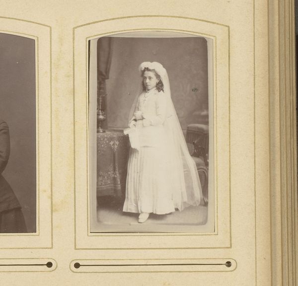 Editor: This is "Portret van een vrouw in klederdracht met een baby op de arm," which translates to "Portrait of a Woman in Costume with a Baby in her Arms," created sometime between 1880 and 1920 by Franz Kullrich. It's an albumen print, and it's quite striking. What aspects of this piece do you find particularly significant? Curator: This image offers a fascinating glimpse into the construction and preservation of cultural identity in the late 19th and early 20th centuries. Photography, still relatively new, became a tool for documenting and, importantly, shaping perceptions of regional and national identities. Do you notice anything particular about how the woman is presented? Editor: Well, the traditional clothing is very prominent, almost staged. Is that significant? Curator: Absolutely. The deliberate display of local dress signals an intent to project a specific image. Photographs like these were often commissioned to promote regional pride or to present a romanticized view of rural life. This photograph speaks to how identity is actively constructed and visualized through cultural symbols. Furthermore, what's the significance, in your view, of including the baby? Editor: Maybe it connects the older traditions with the next generation and shows continuity? Curator: Precisely. The baby becomes a symbol of the future, carrying forward the cultural heritage represented by the mother's traditional clothing. Think about the role of photography in disseminating these curated images – through postcards, family albums – reinforcing and circulating specific narratives about identity. It’s a fascinating intersection of social history and visual culture. Editor: I see that in addition to being a personal portrait, it speaks to larger themes of cultural preservation and representation. Thank you. Curator: And seeing the art through fresh eyes helps me, too! Considering how these images continue to influence our understanding of the past is crucial.