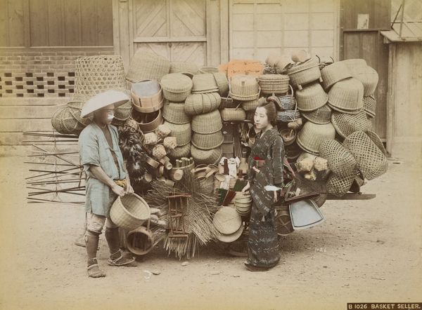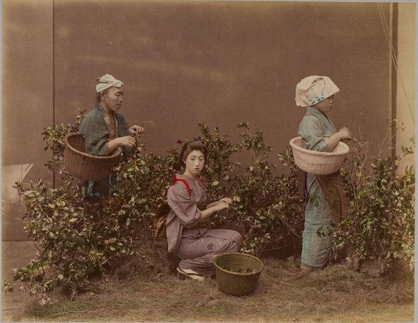 Curator: Raimund von Stillfried's "Drie badende vrouwen in badkuip," which translates to "Three Bathing Women in a Bathtub," dates to sometime between 1871 and 1886. This gelatin silver print now resides here in the Rijksmuseum. Editor: Right away, I'm struck by this quiet intimacy. It’s bathed in soft light, almost sepia-toned. There’s a serenity there, a sense of stolen moment. Curator: Precisely. Stillfried, though Austrian, spent considerable time in Japan, and became known for photographs, like this one, which captured Japanese life and were popular souvenirs for Western visitors. This particular print draws on ukiyo-e traditions, but reinterprets them through a photographic lens. Editor: Ukiyo-e's influence is clear, yet I wouldn’t immediately know this wasn’t an actual painting. Note how the figures are arranged. The foreground figure especially draws the eye down—but that’s disrupted as you keep looking because the subjects are quite Westernized— Curator: I think that's where its subtle tension lies, really. The aesthetic leans into exoticism – it offers something ‘authentically Japanese’. However, it does reflect the artist's cultural background to make it appealing to western sensibilities by incorporating elements like lighting techniques and a more staged setup, rather than candid scene capture.. The scene also invokes questions about cultural exchange and how it mediates foreign perceptions. Editor: True, it becomes this interesting play between capturing, idealizing and potentially romanticizing, the East, or at least a very tailored version of it. The muted palette helps. It strips away any harsh reality. And that framing… it turns an everyday bath into something timeless and very composed. The composition has its own inherent appeal outside of just the figures at the subject of our focus here today Curator: It becomes an artwork for consideration—a lens of many levels of seeing through various disciplines; through Stillfried's journey, technique, and perspective; and by questioning those historical conditions, what this evokes in us as viewers. Editor: Looking at this photograph now… knowing that, makes me wonder, is it beautiful or something else? Curator: It may just be a gentle haunting—with a smile.