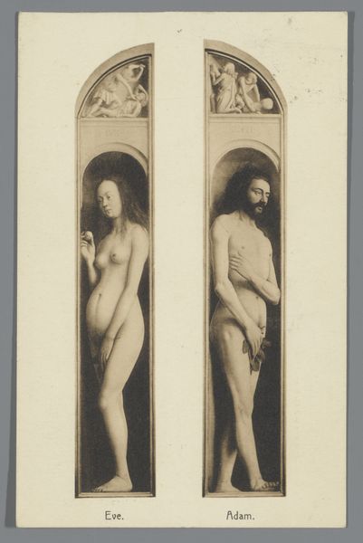 This is a reproduction by Josef Löwy of a painting, presenting two bathing muses. The sepia tones and the composition's division into two triangular segments create a symmetrical yet dynamic visual experience. Note how the artist uses line and form to articulate the figures' bodies, with a deliberate contrast between light and shadow that gives them volume. Each section captures a muse in a private moment of preparation, framed within these geometric boundaries. The choice of presentation raises interesting questions about representation and perception. The muses, traditionally symbols of inspiration, are here confined within rigid shapes, their fluidity paradoxically structured by the artist's formal constraints. It invites us to reflect on how beauty and creativity can emerge from imposed structures, challenging our assumptions about freedom and form. It suggests that art is not merely imitation but interpretation, a play between what is seen and how it is framed.