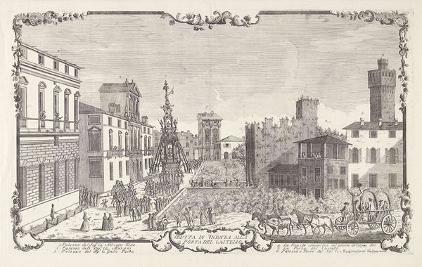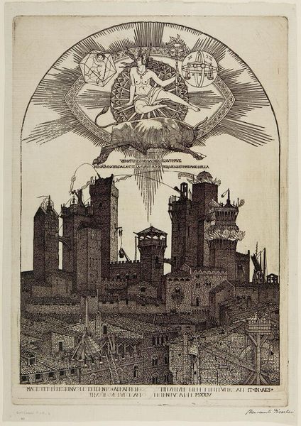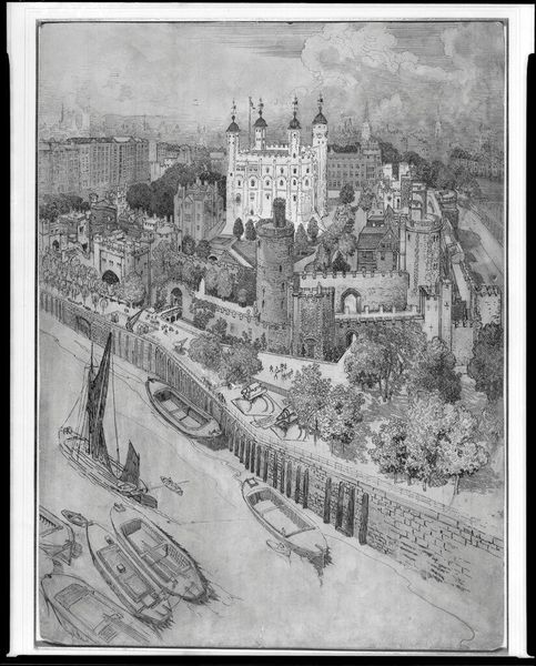 Here we see an undated print by M.C. Escher, rendered in black and white. The composition presents a tightly packed urban landscape dominated by the imposing forms of two cylindrical towers, their surfaces meticulously detailed with lines that suggest the rough texture of stone. Escher’s strategic use of line is fundamental to the print’s effect, creating contrast and structure. The buildings around the towers are similarly defined by vertical and horizontal lines, which build a sense of depth and claustrophobia. This technique creates an interplay between the foreground and background, drawing our eye towards the architectural details, and enhancing the complex spatial relationships. This work destabilizes traditional notions of perspective by compressing space. Escher does not offer a seamless, naturalistic view; instead, he asks us to consider how we perceive and interpret spatial arrangements. His graphic style challenges fixed meanings, prompting us to reconsider established ways of thinking about visual representation. The formal qualities of the artwork, therefore, function not just aesthetically but as part of a broader philosophical discourse.