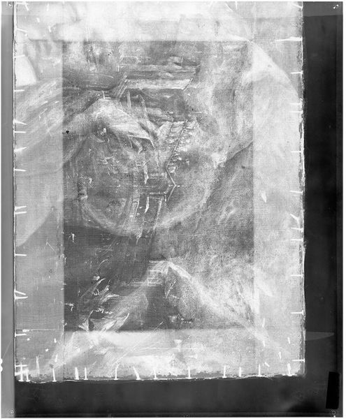 Editor: This is an x-radiograph of the "Raising of Lazarus," by Albert van Ouwater. It gives a ghostly view of the painting beneath. What strikes me is how technical this image is, yet it still evokes a sense of the spiritual narrative. What do you see in this piece? Curator: This radiograph allows us to analyze the social and political implications embedded within the original painting's creation. How does seeing the under layers change our perception of the artist’s intent, his choices, and the power dynamics at play in depicting such a charged religious scene? Editor: So, it’s less about the miracle itself, and more about the context of depicting it? Curator: Precisely. It encourages us to question whose stories get told, how they’re told, and who benefits from their representation. Seeing beneath the surface reveals the layers of meaning. Editor: I see, this really changes my understanding of the artwork!