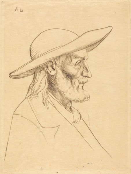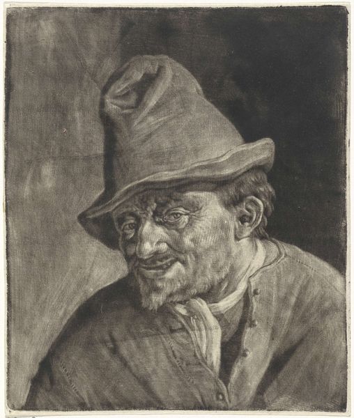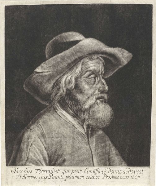 Editor: Here we have a drawing, "Portret van Gerard ter Borch de Oude," circa 1660, by Moses ter Borch. It’s a pencil drawing, giving it this wonderful, almost ethereal quality. What do you see in this piece, what stands out? Curator: Ah, yes. What whispers to me is the quiet intensity. You see, this isn't just a record of a face; it’s a portal. Look at the gentle shading, the way the light catches the brim of his hat, obscuring part of his face... like the half-recalled memories of an old man, softened by time. Editor: I like how you said it feels like a memory! So the obscurity isn’t a mistake, but adds meaning? Curator: Precisely! Ter Borch wasn’t simply interested in depicting what was there, but capturing a feeling, an essence. Imagine Moses, perhaps studying his father's face in quiet contemplation. Do you notice the lines around his eyes? Editor: Yes, now that you mention it, the face has such incredible texture with only pencil lines. It's all so... human. Curator: And that, my friend, is the magic. In a world obsessed with gilded grandeur, Ter Borch gives us the beauty of the ordinary, the profound within the simple. Perhaps a quiet moment of familial love immortalized through a drawing. What do you take away from the portrait, now? Editor: It’s beautiful, this focus on capturing the simple beauty. Thanks, it's a different experience seeing it this way!