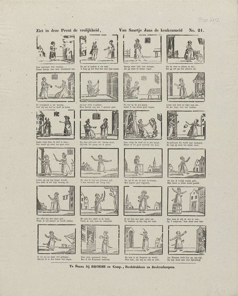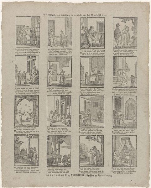 This undated print by Erven Hendrik van der Putte, titled *Thyl Ulenspiegels Leven en Bedryf*, presents a series of vignettes depicting scenes from the life of Thyl Ulenspiegel, a trickster figure from folklore. The dominant visual symbols are those of everyday life intertwined with mischief: characters engaging in simple trades, riding horses, or involved in playful pranks. This integration reflects a broader cultural narrative of the trickster figure, a motif that stretches back through antiquity. Consider the figure of Hermes in Greek mythology, whose cunning and boundary-crossing behavior appear throughout history in various guises. The repetitive, cyclical nature of Ulenspiegel's escapades mirrors a psychological need to confront societal norms. These characters tap into our collective memory, resurfacing in different forms across time and cultures, reflecting the human psyche's ongoing negotiation with authority and societal expectations.