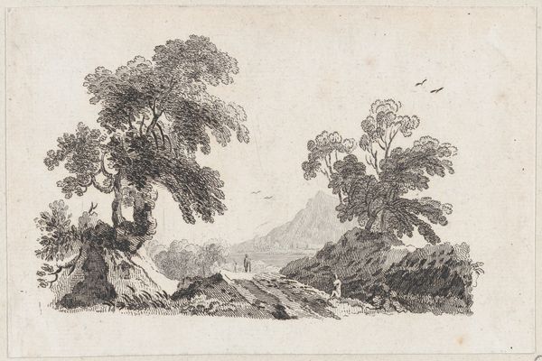 Editor: Here we have Johannes Janson's "Titelprent voor een serie met de twaalf maanden," created in 1783. It's an engraving, and what immediately strikes me is the stark contrast between the detailed foreground and the almost dreamlike quality of the distant landscape. What do you see in this piece? Curator: Well, framing this through the lens of history, consider how Janson's landscape participates in the broader 18th-century shift towards Romanticism and its fascination with nature. What role do you think images like these played in shaping Dutch identity or perceptions of their environment at that time? It presents an interesting window into how society valued and presented the natural world. Editor: That’s interesting. I hadn’t considered its impact on Dutch identity. It almost feels staged though, like a theatre backdrop. Do you think that’s a fair reading, considering its likely public function as part of a series? Curator: Absolutely! Think about how print series were distributed and consumed. They were accessible art, informing public taste and values. How does the artist use line and form to construct a sense of the ‘picturesque,’ catering to contemporary tastes and desires for an idealized nature? It suggests a public engagement with images, filtered through artistry and commerce. Editor: So, the ‘natural’ world isn’t just depicted, but manufactured, in a way, through the conventions of engraving and the art market? Curator: Precisely. This challenges notions of art as a purely individual expression. It also compels us to think about art as a social product, deeply intertwined with institutions, markets, and cultural ideologies of the era. It really changes how we think of the ‘authenticity’ of a landscape. Editor: Wow, that's a really helpful way to consider it. I definitely have a different perspective on it now, less about the beauty of nature and more about how that beauty was packaged and sold to the public.