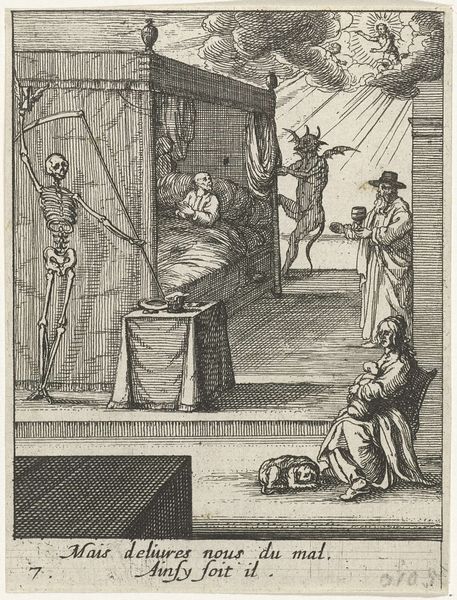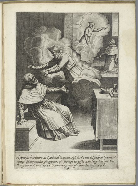 Luca Ciamberlano created this print, "Filippo Neri verschijnt aan Drusilla Fantini", sometime between 1599 and 1641. It depicts a moment of divine intervention and miraculous healing within the intimate setting of a bedroom. Prints like this one were often used to propagate the ideals of the Counter-Reformation. The image plays with gendered notions of piety and vulnerability, showing a woman in a state of distress being visited by a male saint. Drusilla Fantini’s helplessness contrasts starkly with Filippo Neri's radiant, active presence. A contemporary viewer may have seen this not just as a depiction of a miracle, but as a reminder of the power of the church to intervene in individual lives, offering solace and healing in a turbulent time. The scene’s emotional intensity invites us to reflect on our own experiences of vulnerability and the moments when we seek or receive comfort. It serves as a cultural artifact reflecting the social and religious values of its time.