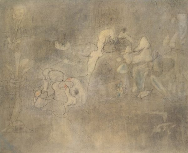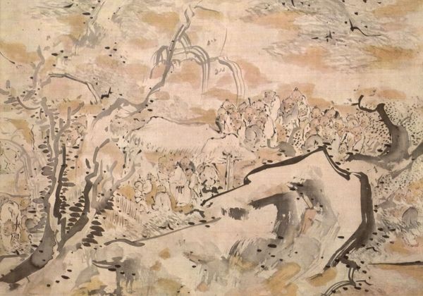 Curator: Here we have Hossein Behzad's "Master the Art and Knowledge" created in 1950. It is an ink and watercolor piece on paper. What are your initial thoughts? Editor: I’m struck by the density and near monochromatic palette. The sheer number of figures crammed into the composition creates a powerful sense of visual overload, and I immediately focus on compositional elements: the soft shading and implied light source, which are at odds with the chaotic grouping. Curator: The means of production here are traditional, of course, reflecting the period. But observe how Behzad utilizes traditional materials to navigate evolving social complexities post-World War II. Ink and paper, readily available resources, underscore the accessibility of artmaking in a time of recovery and shifting cultural priorities. Editor: I appreciate that perspective. However, my gaze returns to the formal elements. Consider the artist's mastery of line. Each figure, though part of a larger mass, retains individual definition. This tension between the collective and the individual contributes significantly to the artwork's complex visual appeal, don't you agree? Curator: Agreed. The figures become abstracted—a visual manifestation of intellectual pursuit. We might consider the labour of art historical narratives themselves: the countless forgotten artists, craftspeople, and cultural workers whose efforts contribute to creating masterpieces like these. It reflects historical erasures within a stratified art system, too. Editor: Perhaps, but focusing solely on socio-economic elements threatens to flatten the experience into political commentary. Isn't it crucial to appreciate how the artist used specific forms—lines, colors, spatial organization—to suggest meaning? The composition’s dynamism keeps my attention moving through the picture plane, urging a careful interpretation of its themes. Curator: I don’t believe those modes of inquiry are mutually exclusive. Examining materials and contexts allows us to investigate meaning *beyond* purely visual interpretation. Editor: In either case, one is compelled to look again, this time armed with richer ways of considering Behzad’s technique.