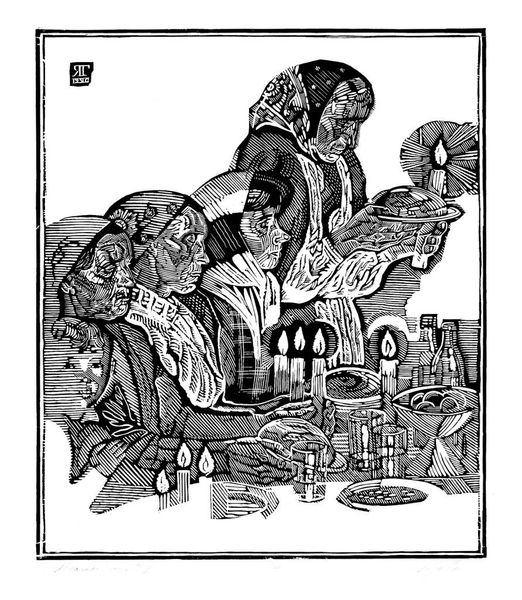 Curator: This is Dorothy Lathrop's 1928 drawing, "The Treasure of Carcassonne," crafted in ink on paper. Editor: It's striking how the black and white contrast heightens the drama. The composition draws you right in—all those coins! It has an almost miniature, stage-like quality to it. Curator: Absolutely, it captures a theatrical intensity. Look at the iconography: the solitary candle illuminates not just the coins, but perhaps the very act of seeking wealth, a universal human narrative across time. Are they truly finding "treasure," or are they trapped in a Sisyphean pursuit? Editor: The dynamism of the lines also dictates the viewing. See how the lines converge at the table's edge? The high contrast and density gives the image so much compositional weight. It's as though the treasure has a material heaviness as well as symbolic value. Curator: Consider Carcassonne's own history. As a medieval fortified city, the location itself conjures stories of sieges and hidden wealth. It invites us to consider our psychological and collective fascination with hidden or inaccessible resources, promising safety and future prosperity. Editor: I am intrigued by the balance she creates by contrasting these soft curving lines used to represent her face to those used to render his, lending a different, harder angle in light of that very focused gaze and posture. I like the way Dorothy plays with light and texture to highlight the narrative tension between these characters, almost setting up this narrative as that between self and other, self and the city or the goal itself. Curator: A potent connection, drawing on centuries of inherited symbols. Editor: This analysis, while succinct, has certainly changed my original read! I find it interesting how that shift can influence visual engagement in art viewing and reception. Curator: Yes, seeing through both our approaches offers greater dimensions into an illustration carrying the weight of not just material value but symbolic worth too.
