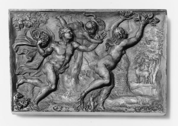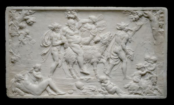 This is a small, ivory relief made by Lukas Faydherbe, populated by playful cupids engaged in a Bacchanalian revelry. The scene brims with symbols of abundance and uninhibited joy, like the ram carrying a child on its back, or the tambourine. The ram, a symbol often associated with fertility and virility, evokes the ancient rituals of Dionysus, the god of wine and ecstasy. Consider, too, the tambourine, a percussive instrument that appears in countless depictions of ecstatic dances from antiquity to the Renaissance. Its sound, capable of inducing trance-like states, transcends mere entertainment. Here we see a powerful force engaging viewers on a deep, subconscious level. This image invites us to partake in a primal celebration of life, blurring the boundaries between the sacred and the profane, echoing through history, and resurfacing in new, ever-evolving forms.