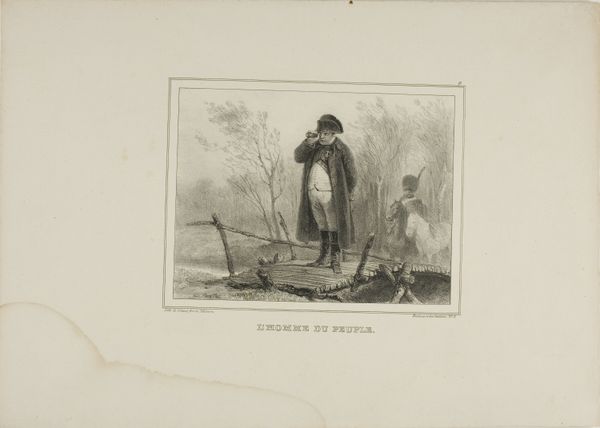 Editor: This is Auguste Raffet’s "Man of the People." It’s a print from the 19th century, and there's a definite melancholy to it. What do you see in this piece? Curator: I see a carefully constructed image designed to perpetuate a specific narrative. Raffet depicts Napoleon as accessible, a man amongst the people, but consider who this image was for. Was it truly for the "people," or for a bourgeois audience eager to romanticize power? Editor: So, the image reinforces a certain social hierarchy? Curator: Precisely. This image is not merely a portrait, it is a political statement, a carefully crafted piece of propaganda designed to influence public perception of power dynamics. It's a mythmaking machine. Editor: That’s a powerful idea. I hadn't considered that. Curator: And that, my friend, is the very nature of visual culture. We must question the message that is being conveyed.