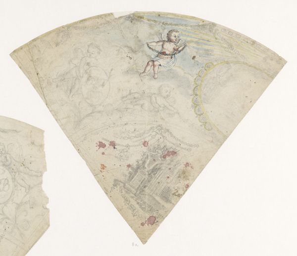 This fan design was made by Jan Brandes in the late 18th century, using graphite on paper. The fan shape immediately tells us about the object's purpose, and the light touch of the drawing conveys a sense of refinement, maybe even luxury. But look closely. The graphite is applied with great care, with thin strokes building up the figures of cupids, garlands, and architectural details. It is a medium that demands precision, making a direct connection to the hand of the artist. The fan’s form guides the design process itself, with its curved edge. The fan itself would have been part of a very intricate system of production, involving specialists in woodworking, painting, and perhaps even the application of precious materials like mother-of-pearl. As such, even a sketch like this one connects us to a wider world of labor, trade, and consumption, which is part of the fan's social significance. It's a reminder that even seemingly simple objects have complex stories to tell.