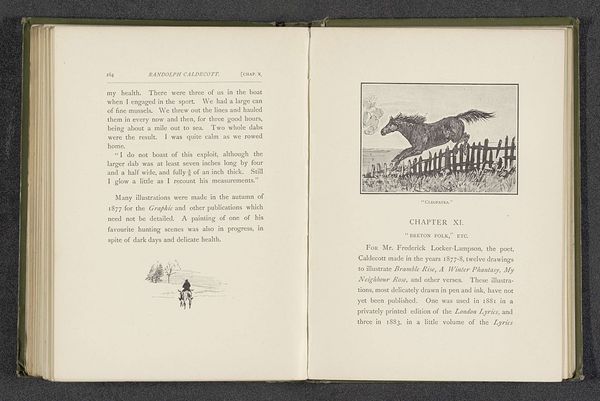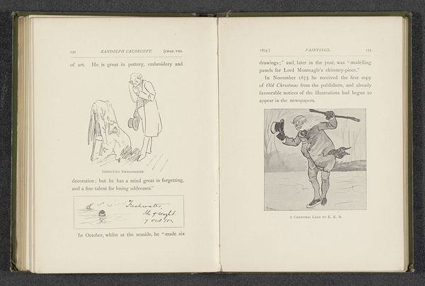 This is a photo reproduction of a new year’s greeting by Randolph Caldecott, though its date and precise origin are a mystery. The image is of a printed page, likely from a book, evidenced by the surrounding text and binding. The photographic reproduction process itself is key here. Think about the labor of the photographer, the darkroom technicians, and the printing press operators who made the reproduction possible. The stark black and white tones, the paper’s texture, and the slight blurriness all speak to the mechanical processes involved. This reproduction democratizes the image, allowing a wider audience to access Caldecott's original artwork. It also raises questions about value: is the reproduction a mere copy, or does it possess its own unique worth as a document of a specific time and technology? Ultimately, this object reminds us that art is always entangled with social conditions and ways of making, blurring boundaries between original and copy, art and craft.