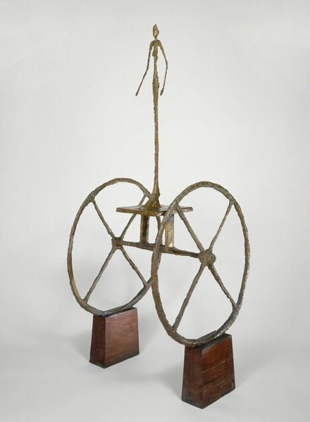 David Hare made this sculpture, likely in the mid-20th century, using metal rods, sheets, and a central brass form. Notice how the artist used techniques such as welding, bending, and patination to transform these materials into a dynamic composition. The rough, almost industrial, nature of the metal contrasts with the delicate balance of the overall structure, which has a slightly apocalyptic feel. Hare was associated with Surrealism, and often incorporated found objects into his sculptures, blurring the line between high art and the everyday. The use of industrial materials and processes reflects the social context of the time, with its focus on manufacturing and production. The labor-intensive processes of cutting, welding, and assembling, are all part of the sculpture's meaning. Considering the materials and making of this sculpture, it is evident that Hare was not only a sculptor, but also a skilled metalworker, challenging the traditional distinctions between fine art and craft.