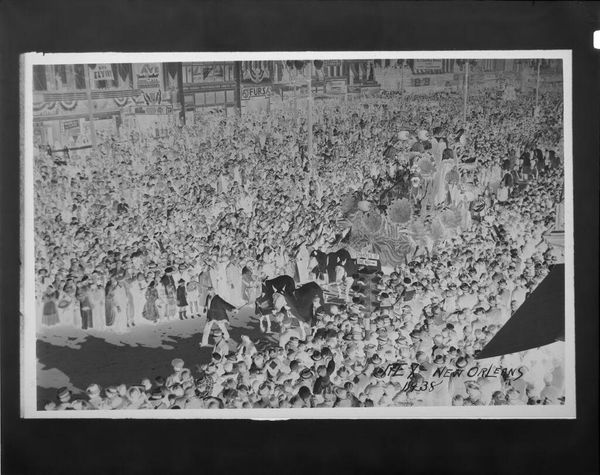 Curator: This striking image, simply titled "Untitled (enormous crowd of people on city street, seen from above)" by Jack Gould, captures a dense gathering. The dimensions of the image are roughly 10 by 13 centimeters. Editor: My first thought is claustrophobia. The sheer number of people, packed tightly together, creates an overwhelming feeling of compression. It’s an unsettling image. Curator: It's compelling to consider the event that drew such a crowd. The photo lacks contextual clues, inviting speculation about its historical moment and social significance. What brought all these people together? Editor: Exactly. The lack of information is almost a statement in itself. Are we meant to focus on the collective, erasing individual identities, or to question the power dynamics at play in such a mass? Who is missing, and why? Curator: A pertinent question, indeed. Gould’s choice of perspective, high above, further emphasizes the scale and anonymity of the gathering, obscuring distinctions. Editor: It makes you wonder about the photographer's own position, both literally and figuratively. What was Gould trying to say about collective action, or perhaps collective vulnerability, at this historical juncture? Curator: Food for thought. Editor: Definitely a work that sparks conversation, even with its unknowns.