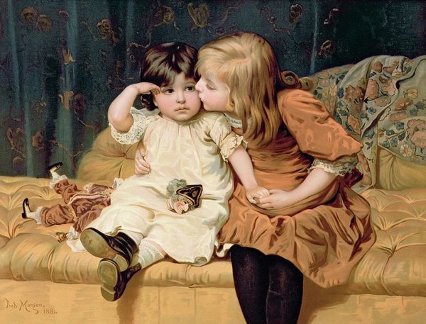Frederick Morgan painted ‘Over the Garden Wall’ in an unknown year, capturing a scene brimming with sentimental charm. The composition is a carefully arranged tableau of childhood innocence, dominated by a fair-haired girl in a pristine white dress and a red-haired boy who embraces her. Morgan’s use of light and colour serves to heighten the emotional tone. The soft, diffused light evokes a dreamlike state, reminiscent of a romantic idyll. The lush greenery acts as a backdrop, framing the children and drawing attention to their interaction. The formal symmetry and compositional balance create a visually pleasing arrangement. The children are centrally placed, anchoring the scene and emphasizing their importance, almost as if they are presented on a theatrical stage. This invites us to view the painting as a constructed narrative, prompting contemplation on childhood, purity, and the romanticization of youth, where Morgan captures a moment of intimate exchange, forever frozen in time.