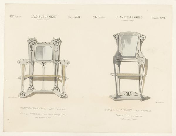 Léon Laroche created this print depicting furniture, including a table and a buffet, using etching. We can see a clear reference to the Louis XV style, which evokes the French aristocracy of the 18th century. The furniture designs, with their elegant curves and refined details, speak to a culture of luxury and ornate aesthetics. Published in Paris, this print likely circulated among furniture makers or wealthy patrons. The style represented here embodies social status, and this image could have served as a source of inspiration or a catalog of available designs. The institutional context here is the world of design and commerce, where images play a crucial role in shaping tastes and desires. To fully understand the implications of this image, we might turn to archives of design history and the history of commerce. These resources could show how art and design were intertwined with broader social and economic transformations.
