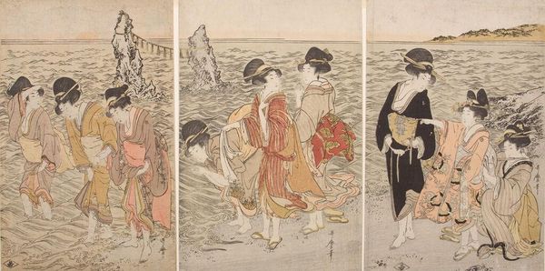 Editor: This is "Women at the Beach of Futami-ga-ura," a woodblock print by Kitagawa Utamaro from the late Edo period. It strikes me as so graceful, the way the women are arranged against the water... What do you make of this piece? Curator: Graceful indeed! I see a deliberate choice to depict women enjoying leisure, a gentle rebellion against societal constraints, perhaps? Notice the flowing lines mirroring the water, guiding our eyes, and the colors, subdued yet evocative. It’s like Utamaro whispers a story, doesn't he? Editor: I see it now! The water almost feels alive because of those lines. Curator: Exactly! Art's magic, isn't it? Finding life where we least expect it. Editor: Totally. I see it so differently now!
