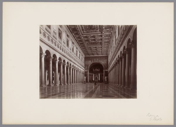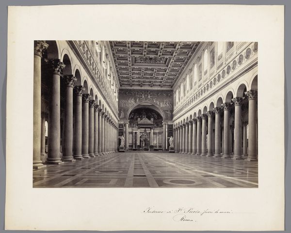 This photograph by Fratelli Alinari shows the interior of the Basilica di San Paolo fuori le Mura in Rome. Captured with a camera and printed on paper, the image speaks to the industrialization of photography in the 19th century. Consider the stark contrast to the handcrafted mosaics and marble columns depicted. These were made through intense physical labor, while the photograph was created with a machine, using standardized chemical processes. This underscores the shift from manual production to mechanical reproduction during the period. Photography democratized the dissemination of images. It allowed people to experience the grandeur of places they might never visit in person. Here, the architecture's imposing scale is emphasized by the photograph's technical precision. The Alinari brothers were pioneers in this respect. They documented Italian art and architecture, turning cultural heritage into commodities for consumption. This brings up questions about the relationship between art, labor, and commerce, challenging distinctions between documentation and interpretation.