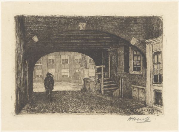 Alexander Schaepkens created this etching, “Helpoort te Maastricht”, using ink on paper. The Helpoort, or Hell’s Gate, was constructed in Maastricht, Netherlands in the 13th century. It is the oldest city gate in the country. In the middle ages, city gates acted as ports of entry for commerce and points of contact for outsiders, and also served as fortifications and defensive structures. Schaepkens’s atmospheric rendering of the gate shows the influence of Dutch Romanticism. The image presents the gate not only as a historical artifact, but as a space in which daily life unfolds. We see people traversing the opening, going about their day. To understand Schaepkens's image more fully, we might consult historical records and city plans to learn more about the gate's changing function over time and the cultural significance of Maastricht. Only then can we appreciate the complex social dimensions of this seemingly simple work.
