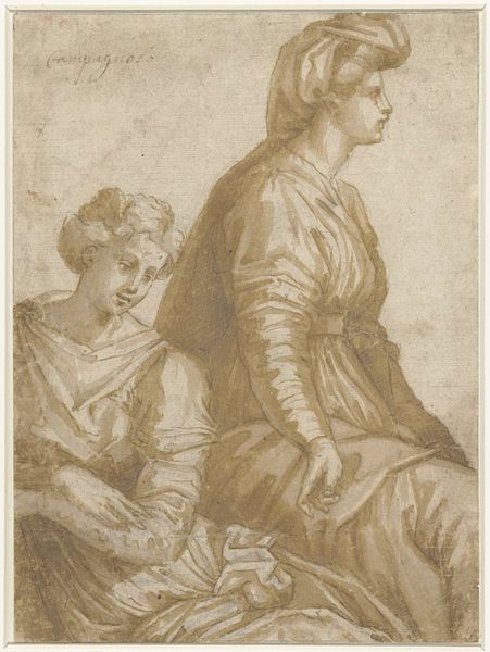 Curator: Gazing at Jan Verkolje's "Woman and Man in a Window," created between 1685 and 1693 with pen, charcoal, and pencil on paper, I am struck by the delicate rendering and subtle theatricality of this genre scene. What jumps out at you? Editor: Hmm, intrigue. It's almost too perfectly staged, wouldn’t you say? They seem like players caught mid-scene; that shared glance, the goblet, that feathered hat, and the hint of naughtiness… oh, that extended arm and subtle breast. It all speaks of hidden stories. Curator: Ah yes! Jan Verkolje was a master of intimacy. That extended arm almost dares us to cross some threshold into the depicted event. You could say he masterfully orchestrates his compositions to capture an instant, making the viewers like willing eavesdroppers. Look closer at the textures—the silky clothes versus the coarse stone. Notice also that the symbolism he imbued carries tremendous weight and contributes greatly to a playful dialogue. The textures look almost real enough to touch. Editor: Symbolism is at play everywhere, don't you think? That glass he holds feels so precarious! Almost as if his behavior might affect the amount of wine she might lose. Perhaps those architectural bars reference ideas around control. Is she trapped? Is she willingly engaging in what’s about to unfold? Alluring ambiguity at its finest. Curator: Exactly! Jan Verkolje teases the viewer without revealing all, sparking all sorts of playful guessing and moral questions that echo throughout the Dutch Golden Age period. But ultimately I feel that the work goes beyond period interests. Verkolje allows us, almost inadvertently, to probe questions of attraction and social status between male and female archetypes. Editor: True! Looking at this artwork does bring to the fore, perhaps above all, an awareness about performance, of how desire manifests in symbolic acts that invite curiosity to ask profound, if perhaps uneasy, questions of life.