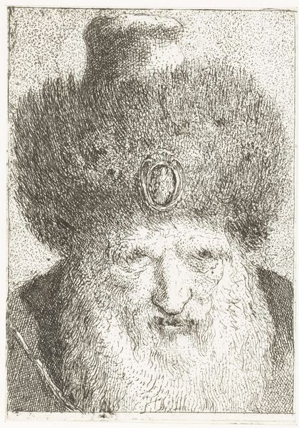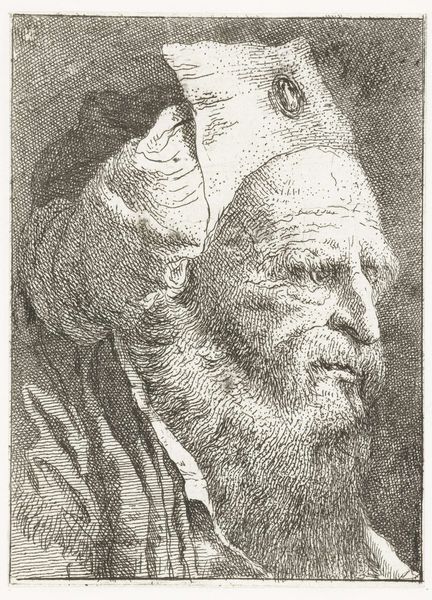 Giovanni Domenico Tiepolo made this print, "Old Man with a Fur Cap," using etching, a technique that demands planning and skillful execution. Tiepolo would have covered a metal plate with a waxy, acid-resistant ground. He then used a sharp needle to draw the image, exposing the metal. Next, the plate went into an acid bath, which bit into the exposed lines, creating grooves. The longer it soaks, the deeper the lines become, which means more ink can be held, and that creates darker lines on the final print. After cleaning off the ground, Tiepolo would have inked the plate, wiped the surface clean leaving ink only in the etched lines, and then pressed it onto paper. The result is a mirror image of the original drawing. The quality of line suggests the speed and certainty of the artist’s hand. The print medium also allows for the reproduction and broad circulation of Tiepolo's work, making it accessible to a wider audience beyond the traditional elite art patrons. It’s a reminder that the art world isn’t just about unique masterpieces, but also about how images are spread and shared.