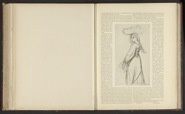 Editor: Here we have "Reproductie van een aquarel van een portret van onbekende vrouw met een waaier door Angelo Trentin," or a reproduction of a watercolor portrait of an unknown woman with a fan by Angelo Trentin, created before 1892. The original is housed here at the Rijksmuseum! What immediately strikes me is how delicately rendered this woman is, almost ephemeral, like a fleeting memory. What do you see when you look at this print? Curator: What commands my attention is the interplay between line and wash. Notice how the artist employs delicate hatching and cross-hatching to define the form of the dress, juxtaposed against the softer, more fluid watercolor washes used for her face and the background. How does that contrast contribute to the overall aesthetic impact, do you think? Editor: It's almost like he’s capturing her in different dimensions – a precise rendering versus something a bit dreamier, emphasizing perhaps the coquette aspect. The sharp lines against the washes makes her feel both present, yet somehow distant at the same time! Is there any indication of artistic influence at play here? Curator: Absolutely. Observe the emphasis on capturing light and shadow through varied tonal values. Trentin demonstrates an interest in representing the transient effects of light, reflecting the academic approach favored at the time, yet without entirely foregoing a certain attention to emotional impact through the sitter’s expression and pose. Editor: So the contrast and lighting are key to the reading of both form and expression. It all contributes to how the portrait conveys meaning beyond just the image of the sitter, very thought-provoking. Curator: Indeed, the genius of this work lies in the synthesis of technique and emotive representation. It provides us with an excellent example of the artist leveraging the materials and approaches to elevate what otherwise might be a standard portrait into something worthy of deeper examination.