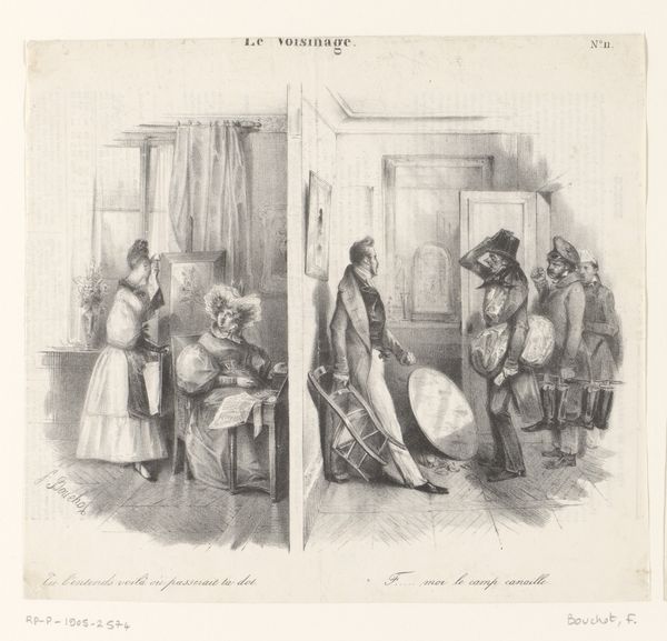 Curator: Fréderic Bouchot's "Jonge vrouw bespioneert een schilder in zijn atelier", or "Young woman spying on a painter in his studio," made in 1832, is rendered with engraving on paper. Note the stark contrast produced by the linear quality of the medium. Editor: My first impression is of an intercepted narrative, frozen in time. There’s a delightful sense of both humor and intrigue embedded within this piece, amplified by the furtive actions of the young woman. Curator: Indeed. Notice how Bouchot strategically employs contrasting spatial planes? The composition cleaves the scene, bisecting the spaces of observing and observed, private and public. It almost performs a silent film strip trope of adjacent scenes. Editor: Symbolically, the image speaks volumes about social mores. The young woman peering—it implies a clandestine act, potentially defying social expectations of female decorum in that era. She literally looks like a curious and self-assured individual who does not necessarily believe in social conventions, especially as her clothes don't have many luxurious adornments compared to what was usual at the time, but still very proper. Curator: Semiotically, the palette itself enforces a sense of order—the interplay between stark white paper and deeply contrasting line work implies a certain rigidity, a formalism of social hierarchy which the iconography suggests are about to be playfully destabilized. It feels structurally clever. The space created by lines on a bare paper offers many interpretations. Editor: And the placement of the artist within the confines of his atelier underscores the artist’s perceived creative freedom—a privilege perhaps envied or questioned by the woman. One may suggest that Bouchot's intention was to invite viewers to reflect on gender roles, power dynamics, and the allure of forbidden knowledge within 19th-century society. The whole image evokes those conflicts. Curator: Fascinating; your cultural reading indeed allows one to consider its continued relevance. Considering just the line quality and composition alone, I find it remains a wonderfully engaging example of formal artistic technique. Editor: Yes, by integrating symbolic investigation and visual exploration, it provides us with richer insights into Bouchot's intention and impact. It adds valuable insight beyond merely analyzing lines on paper.
