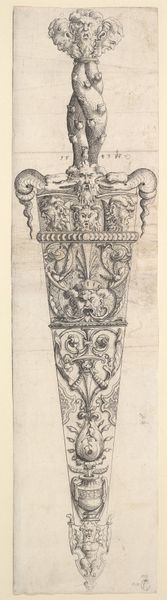 This drawing, thought to be a design for a screen, was made by Philipp Schor sometime between 1646 and 1715. Rendered in pen and brown ink, the design captivates with its ornamental complexity and allegorical figures, immediately evoking a sense of Baroque grandeur. The composition is structured around a strong vertical axis, flanked by elaborate scrollwork and mythological creatures. Note how Schor uses line and form to create a sense of depth and movement. The swirling tendrils and stylized acanthus leaves fill the space with dynamism. The figures of a hybrid siren and griffin are strategically placed to anchor the design, their sculptural forms lending weight and balance. Consider the semiotic implications of these choices. The classical motifs—the acanthus, the mythological figures—speak to a desire for order, yet the extravagance of the design pushes against the boundaries of traditional aesthetics. The result is a compelling visual interplay between restraint and exuberance. Schor challenges the viewer to rethink fixed notions of beauty and structure.